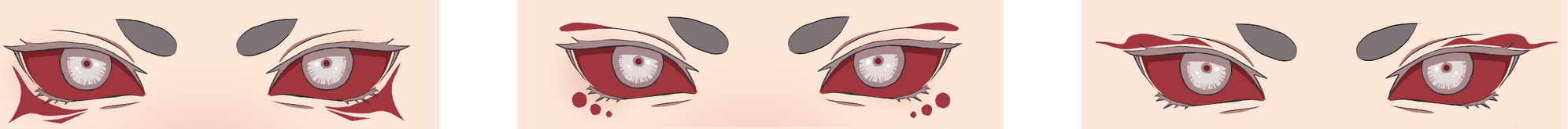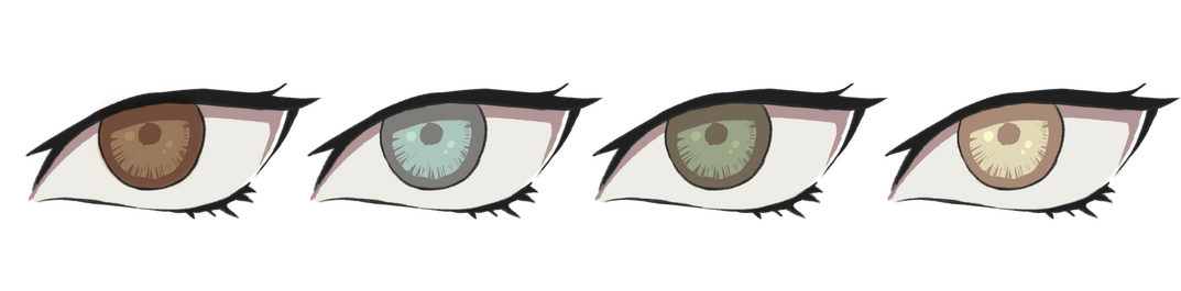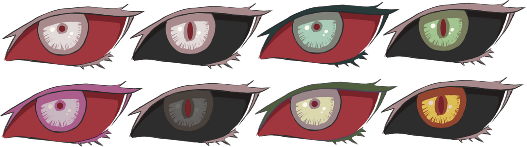 common sclera colors include red and black. All natural iris colors are present as well. Pupils are usually red or a darker shade of the iris.